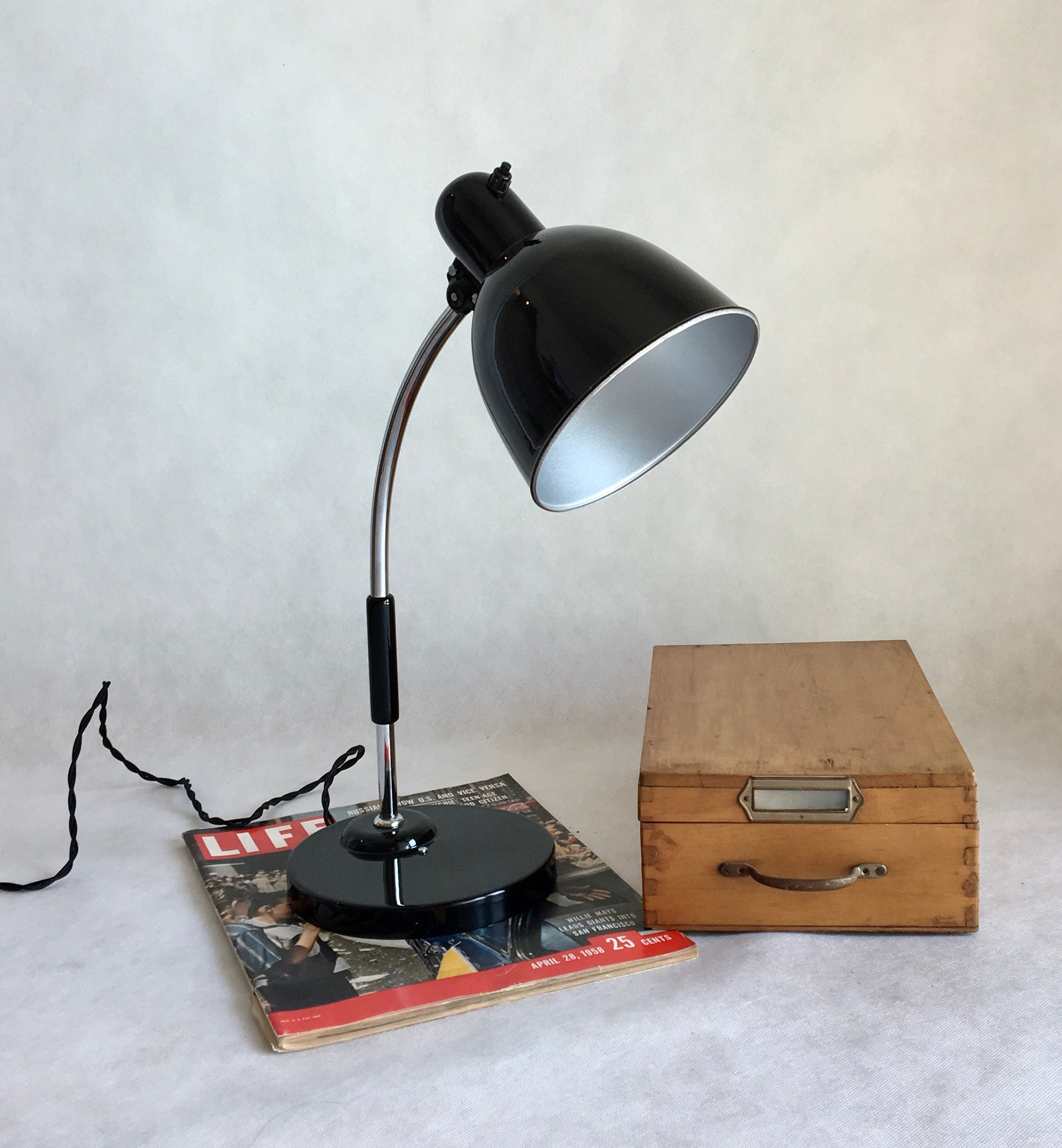 Industrielle Schreibtischlampe aus den 1930er. Die Lampe wurde komplett restauriert und neu lackiert. Die Technik der Leuchte funktioniert einwandfrei.