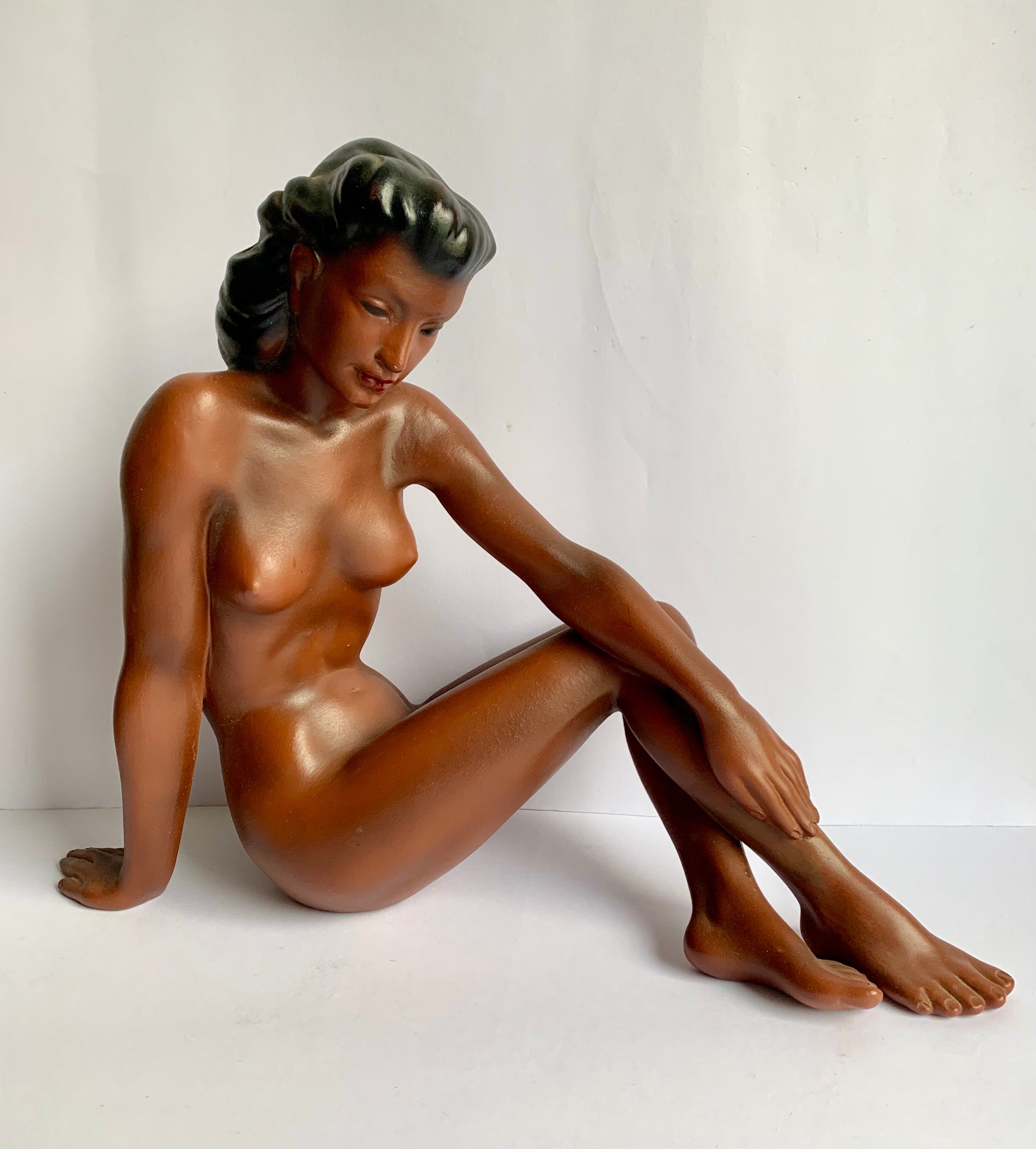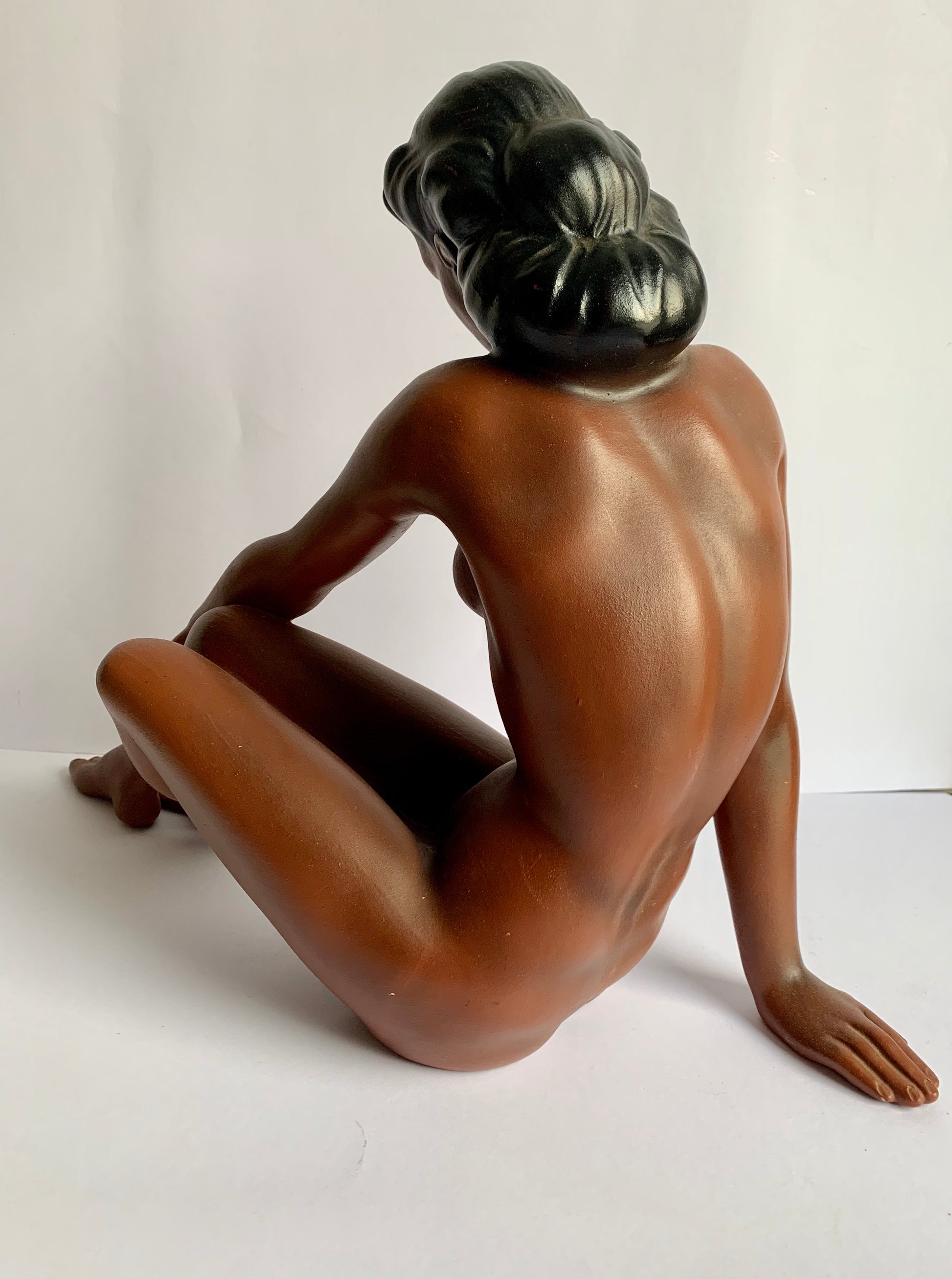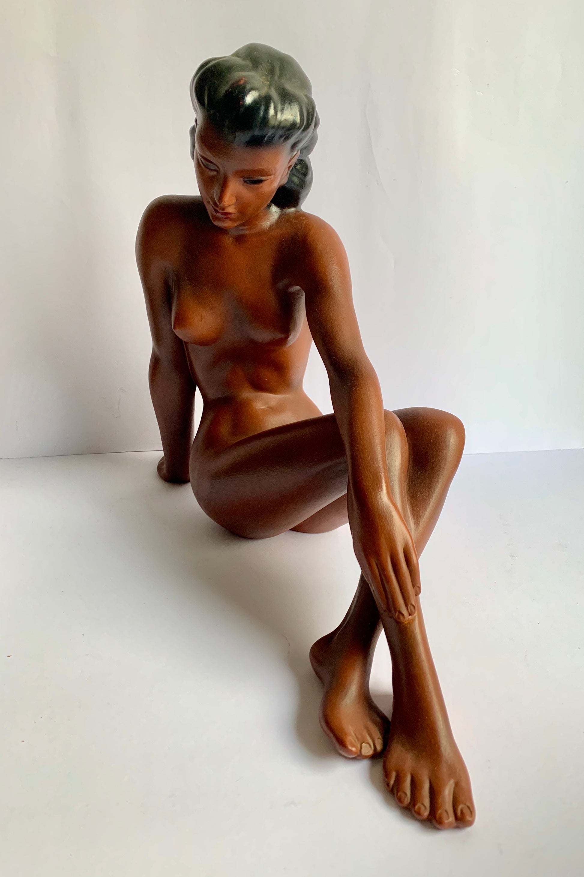 Dekorative Keramikfigur eines sitzenden Frauenakts aus der renommierten Gmundner Keramikmanufaktur, 1960er Jahre. Modellnummer 2468. Die Figur befindet sich in idealem Zustand.