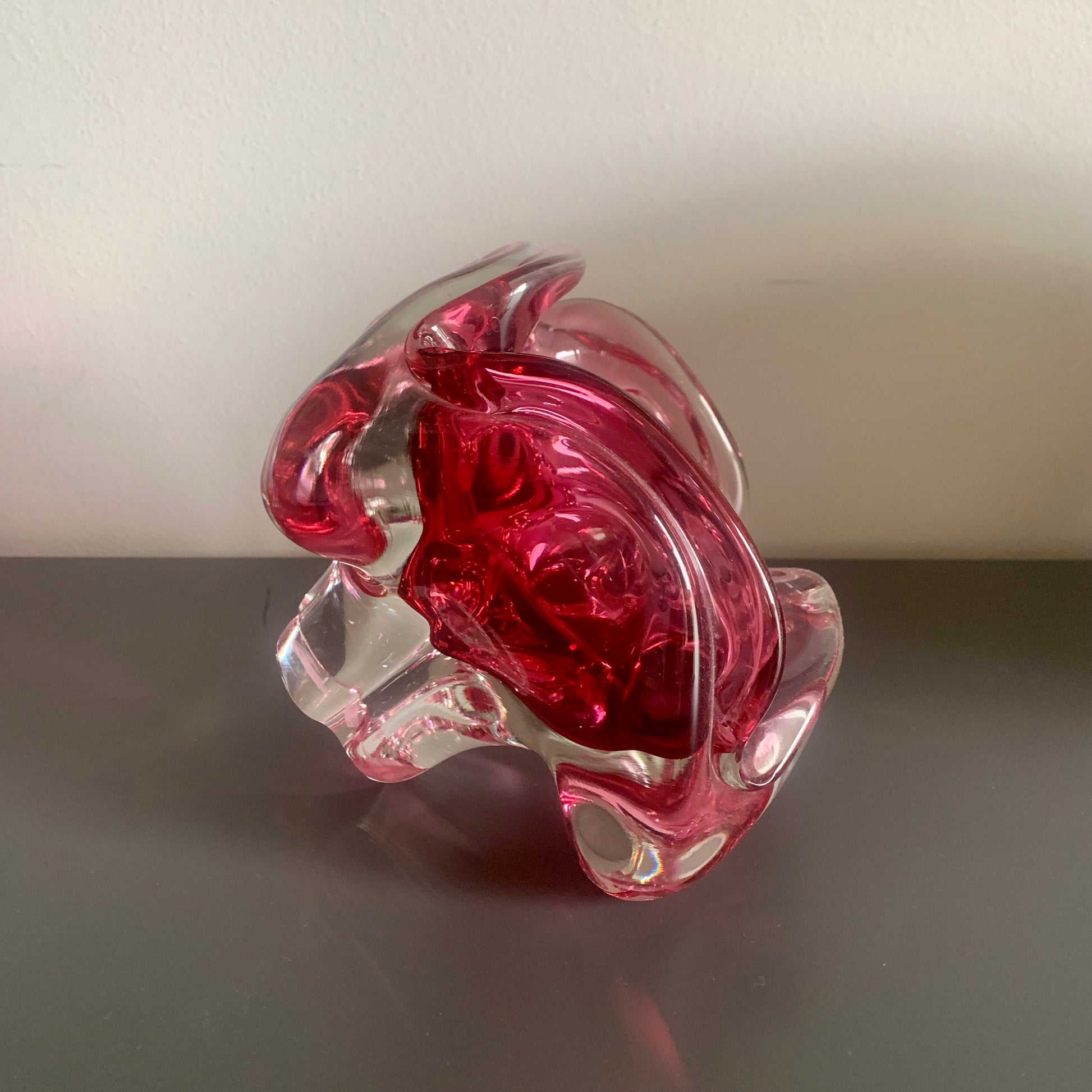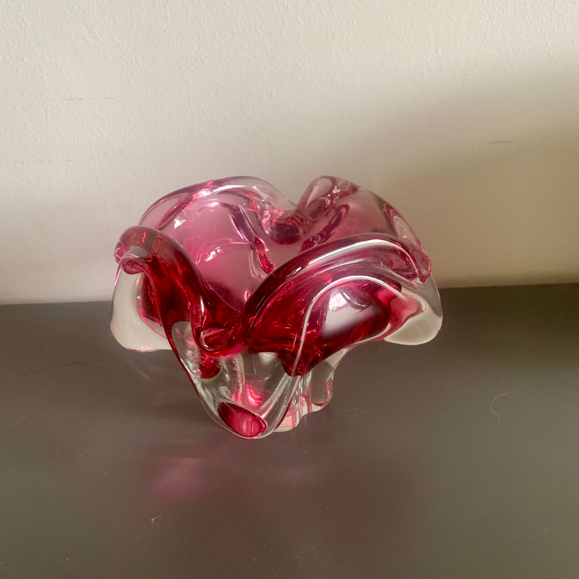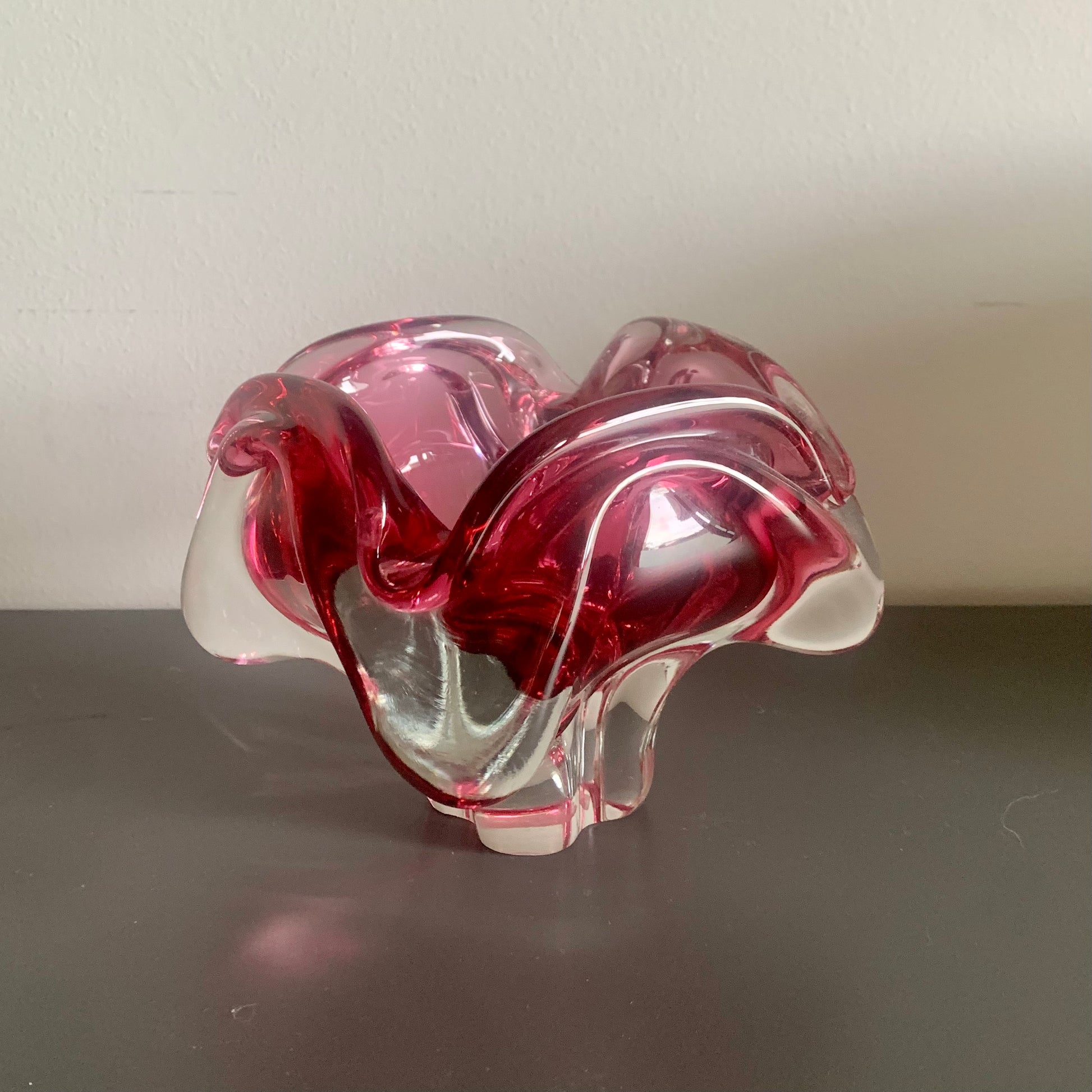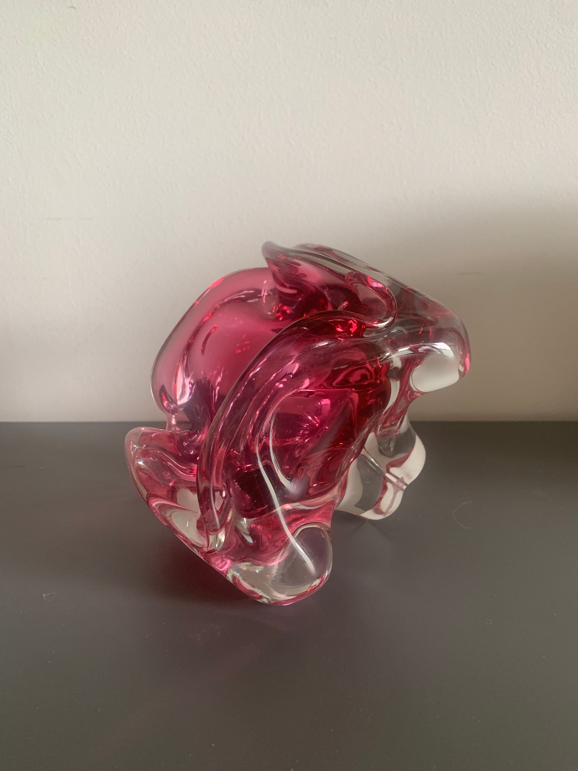 Gefertigt aus formgeblasenem Glas, in der Masse rosa gefärbt.
