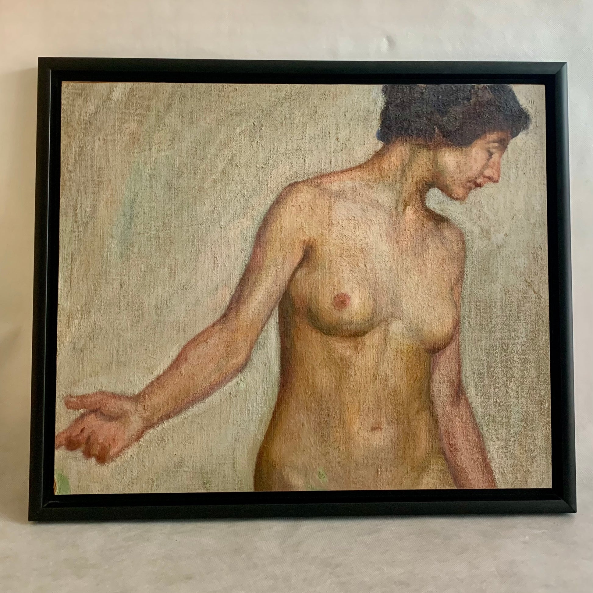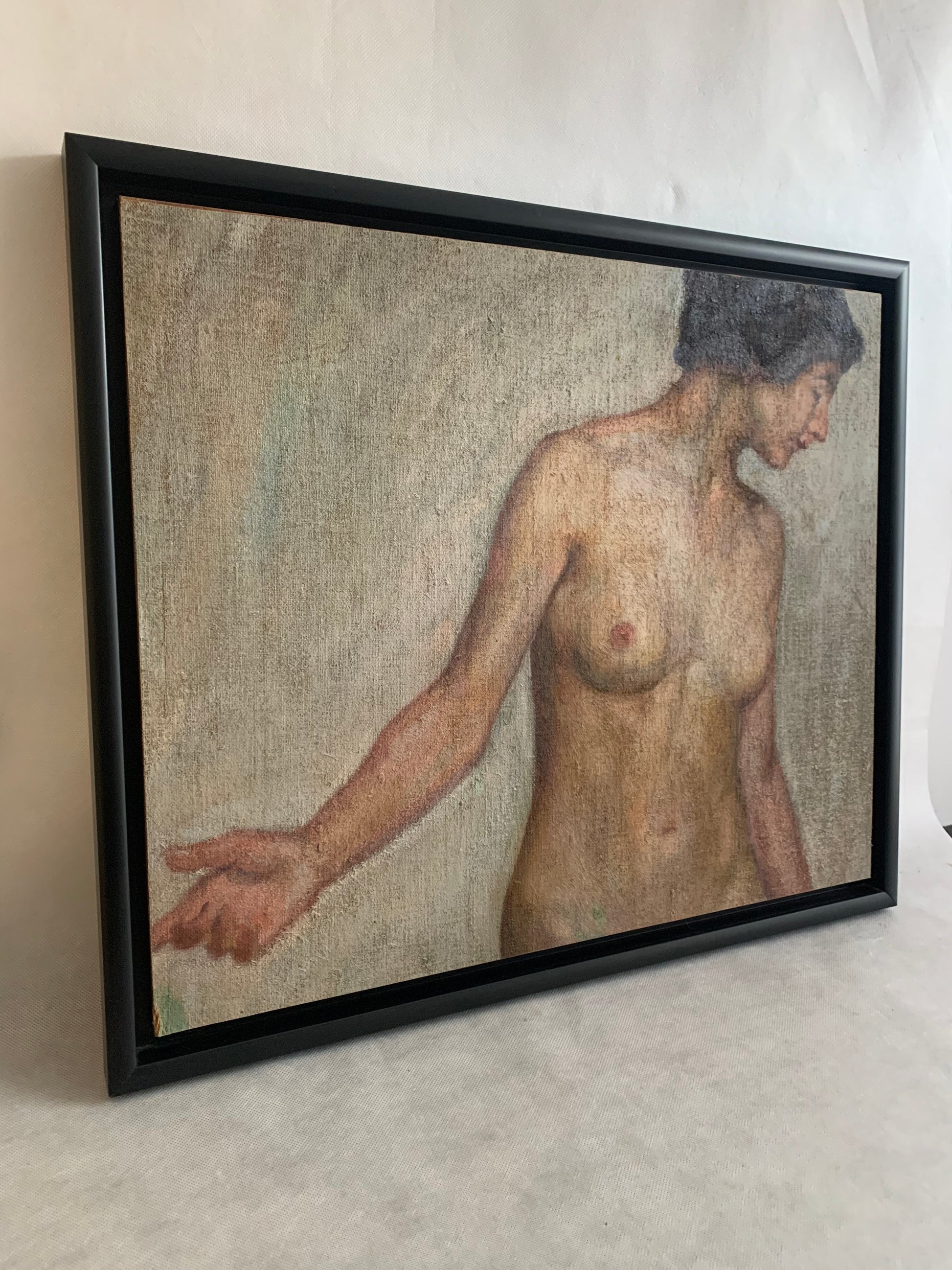 Schöne Aktdarstellung einer stehenden Frau mit zur Seite geneigtem Kopf und leicht erhobenem Arm vor hellem Hintergrund.
