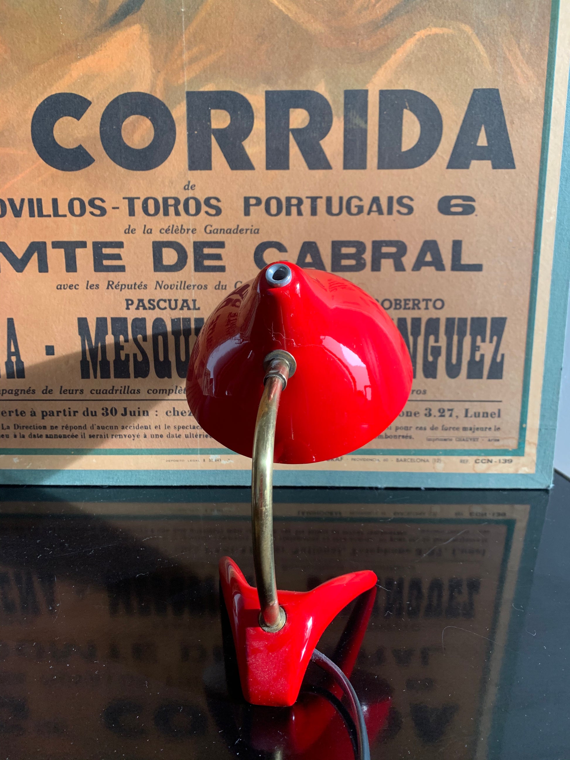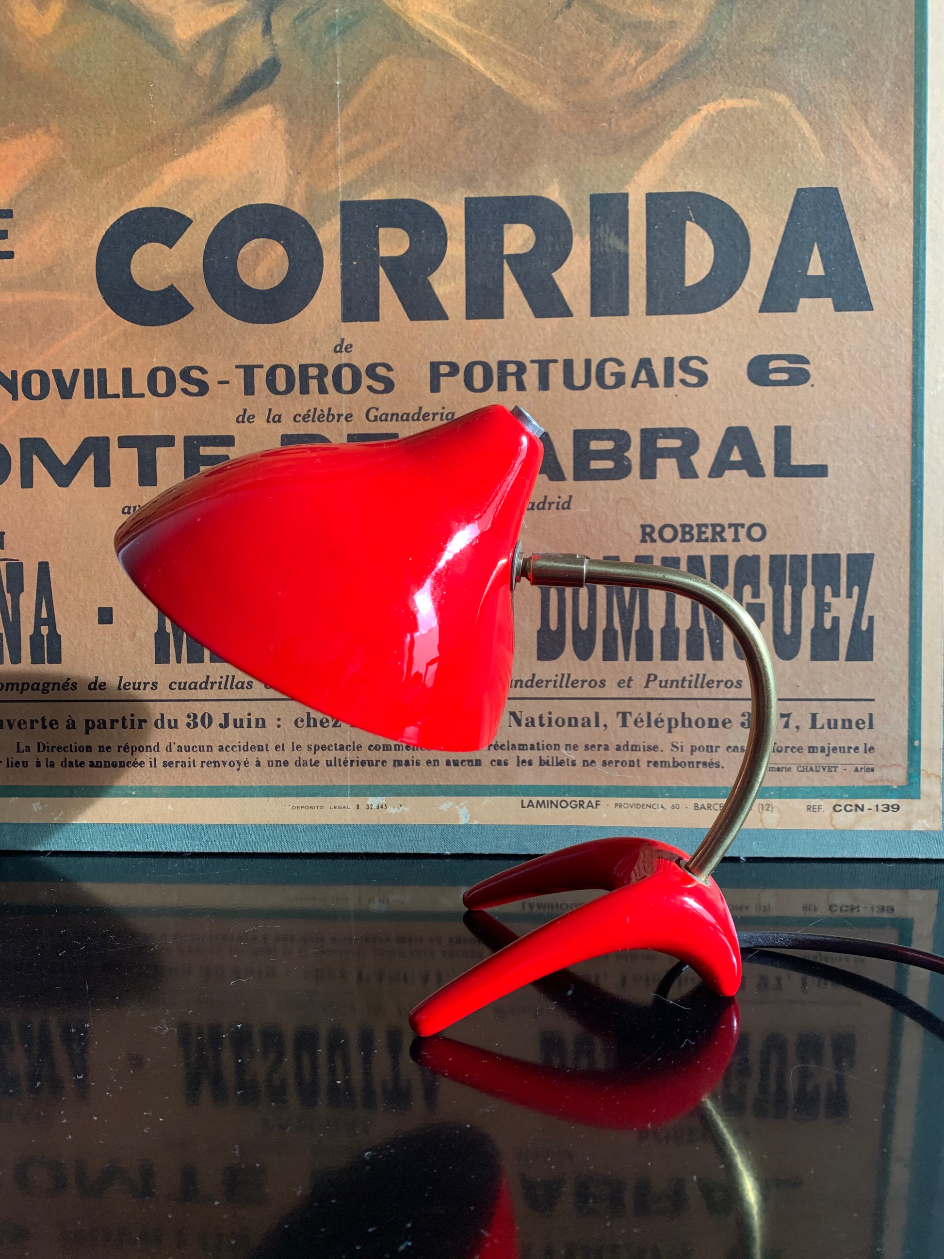 Stilvolle Tischlampe, entworfen von Louis Kalff für Philips - ein zeitloser Designklassiker aus der Mid-Century-Ära. Das Stück wurde aufwendig restauriert und in einem markanten Marlboro-Rot neu lackiert. Das Elektrokabel wurde ebenfalls erneuert