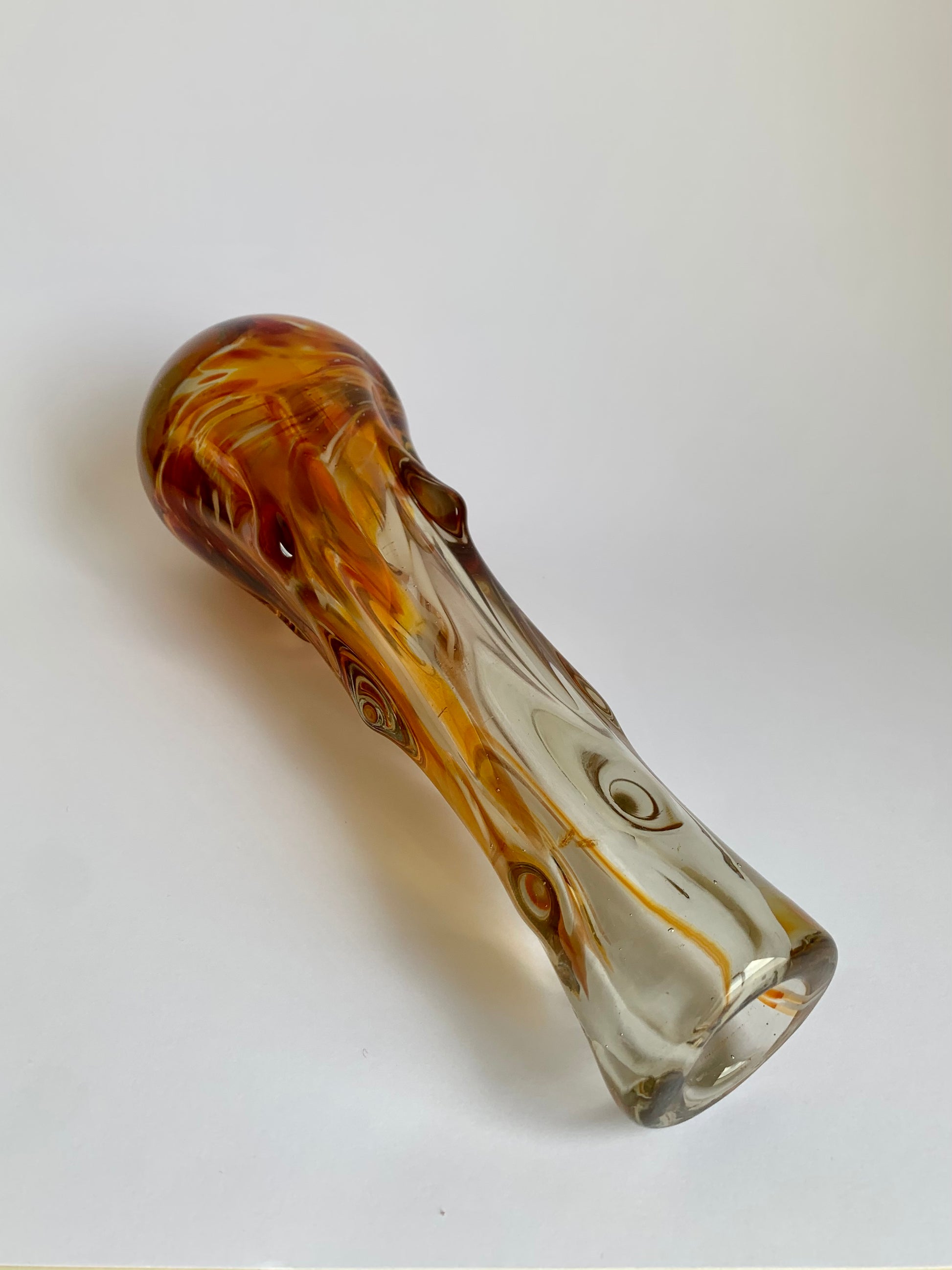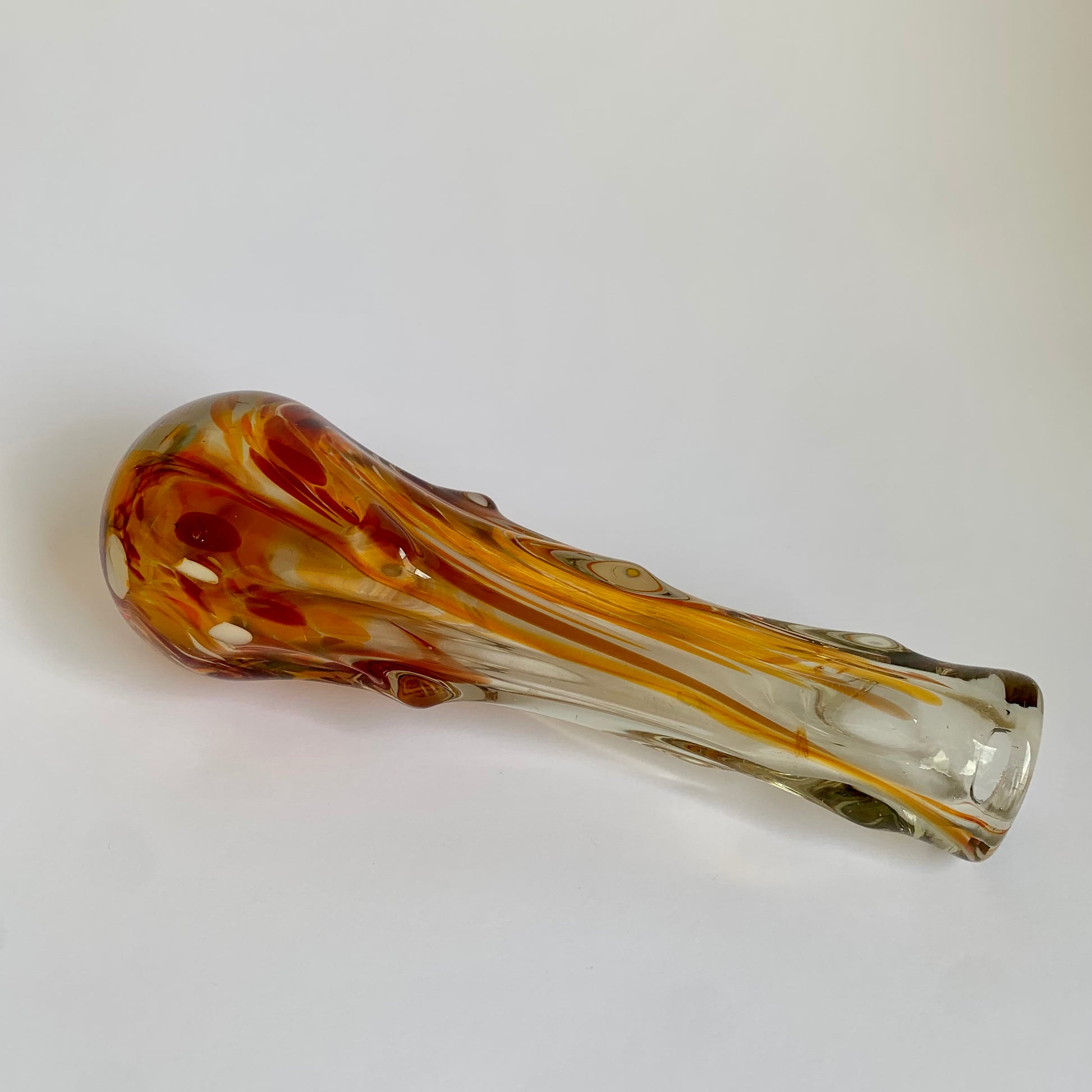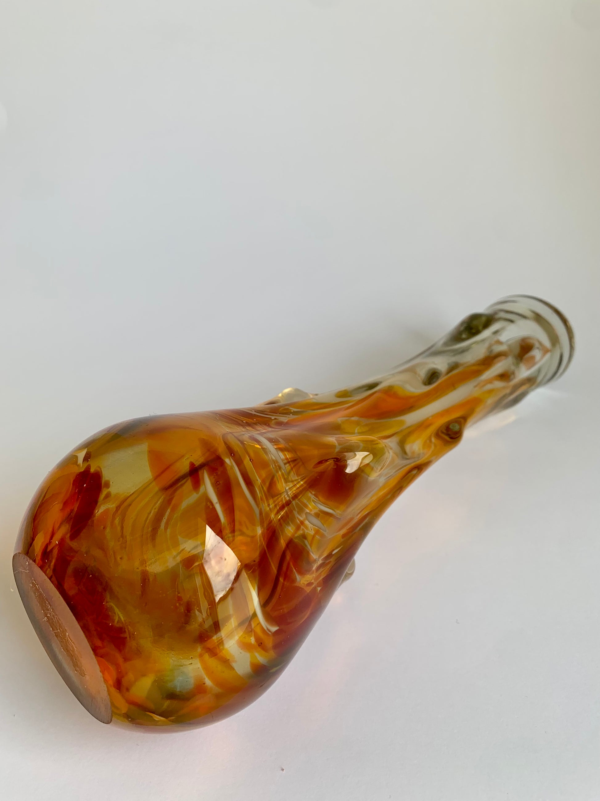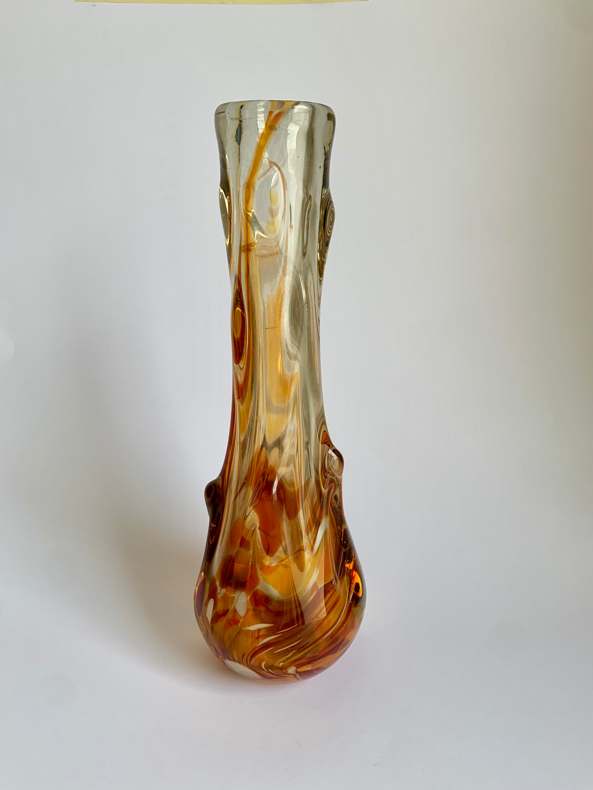 Schöne Vintage-Kunstglasvase mit organischer Form und bunten Details. Die kräftige orange Farbe und die eingearbeiteten Farbakzente machen sie zu einem besonderen Dekorationsstück. Sehr guter Zustand mit nur leichten Gebrauchsspuren.